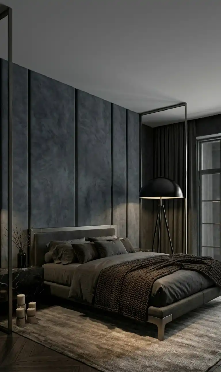 Dark Moody Bedroom: Suede Wall Upholstery & Ebony Wood Inlays