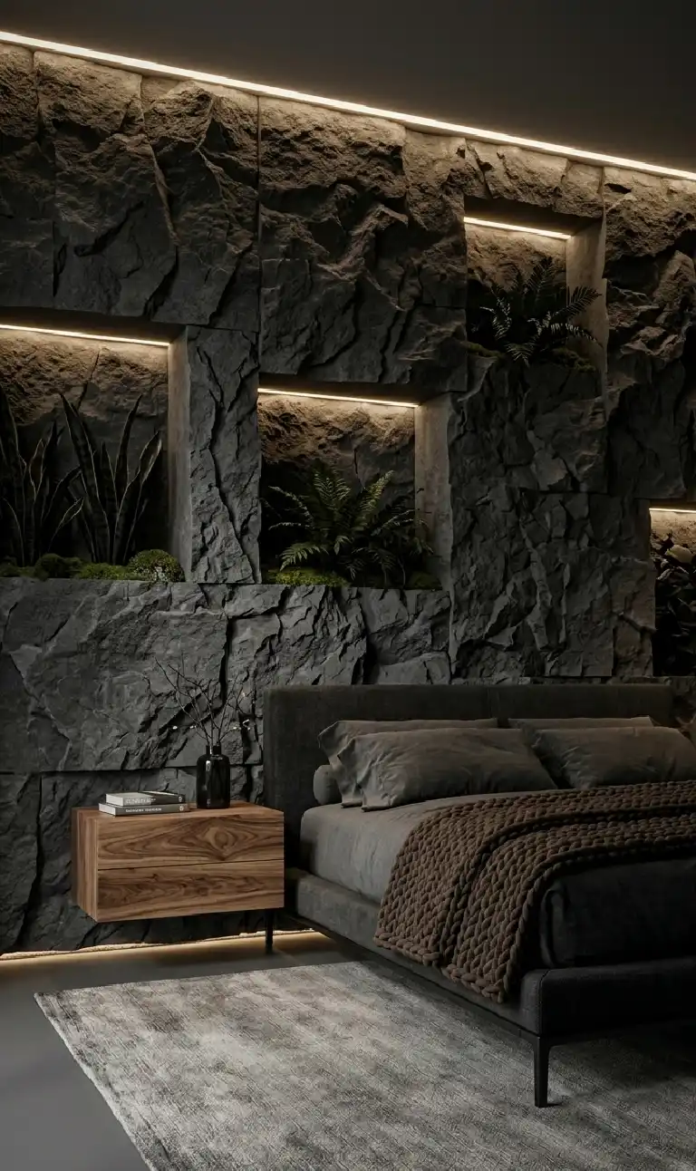 Dark Moody Bedroom: Tectonic Basalt Stone & Integrated Biophilic Cavities