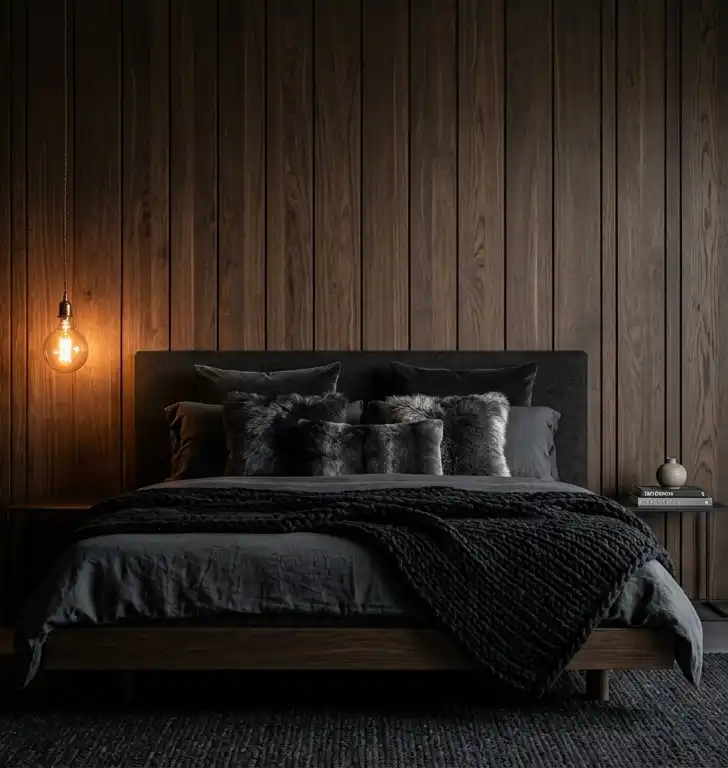 Dark Moody Bedroom: Vertical Oak Paneling and Charcoal Textile Contrast