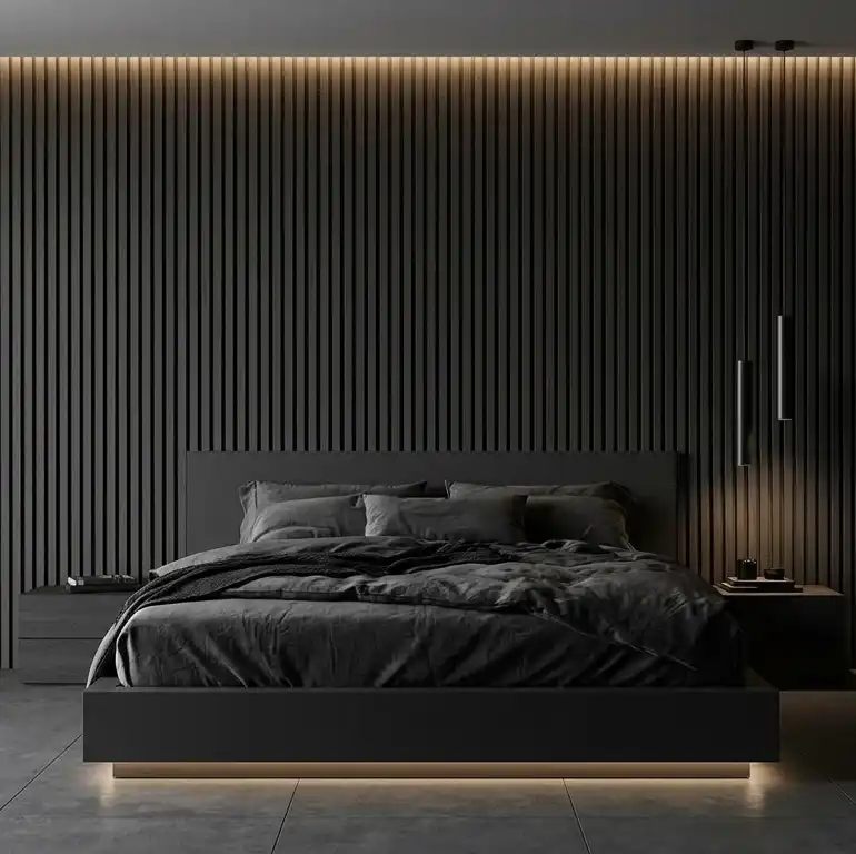 Dark Moody Bedroom: Vertical Slatted Charcoal Wood & Recessed Linear LED