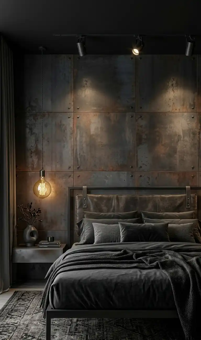 Dark Moody Bedroom with Industrial Oxidized Steel Elements