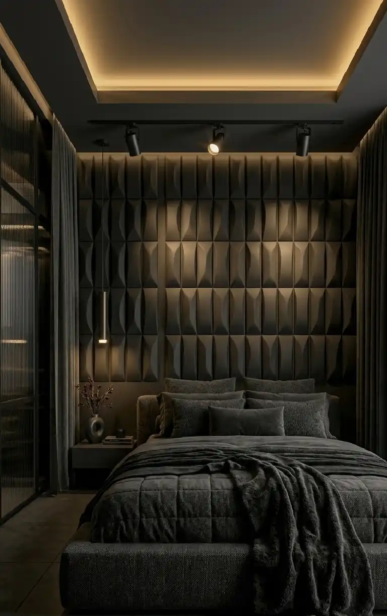 Dark Moody Bedroom with Sculptural 3D Wall Panels