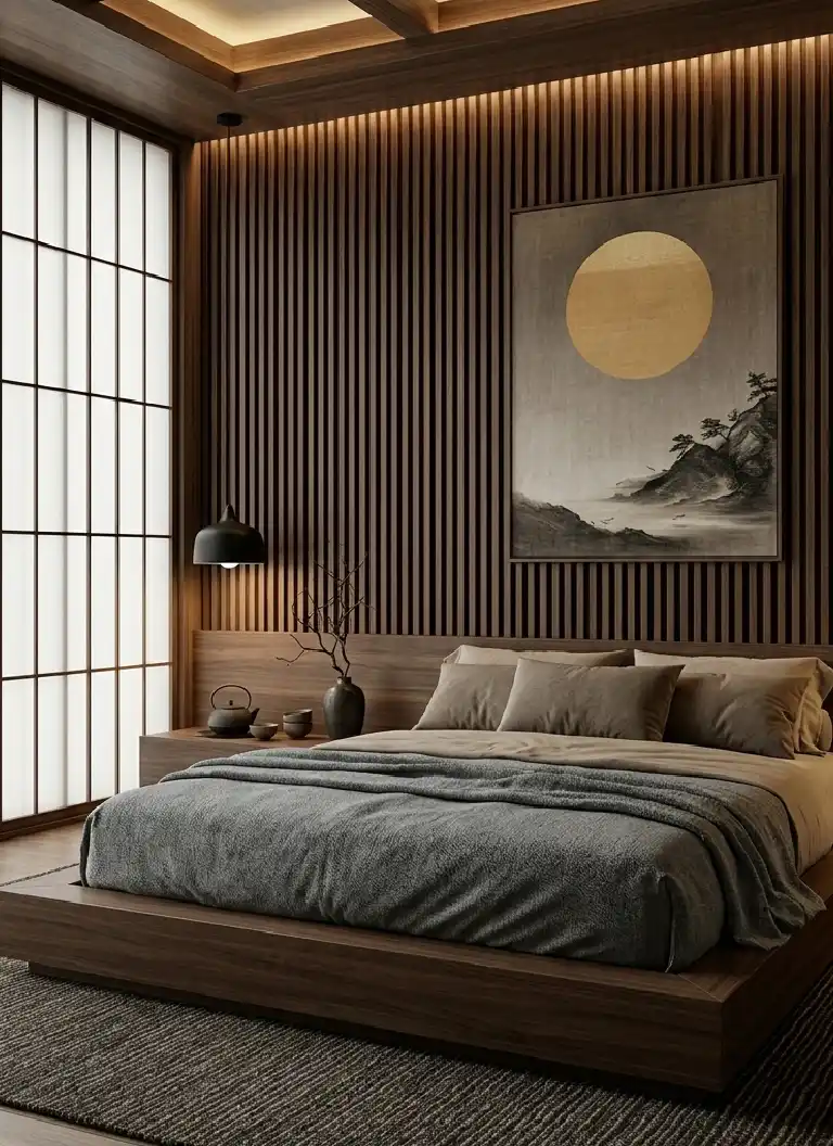 Dark Walnut Japandi Bedroom Idea with Cove Lighting and Acoustic Slat Paneling