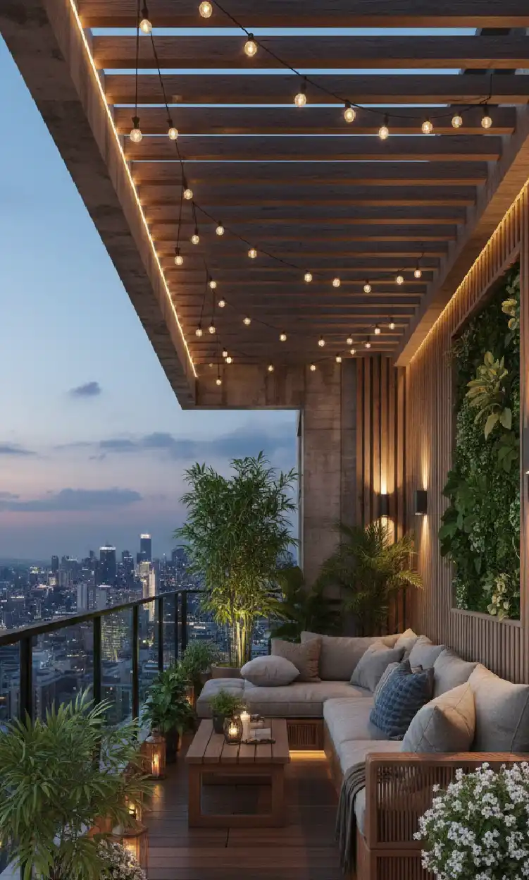 Elevated Urban Retreat with Lantern Glow balcony