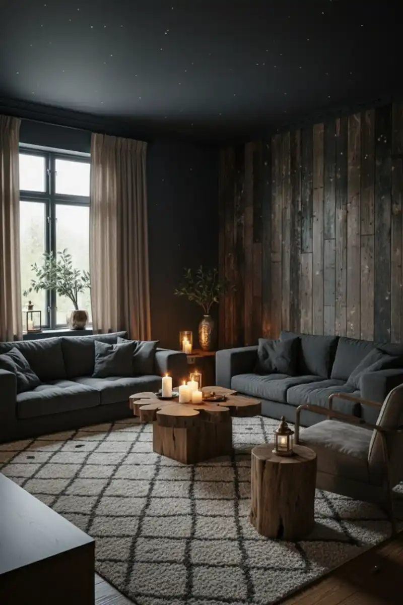 This captures a sophisticated and moody living room, perfect...