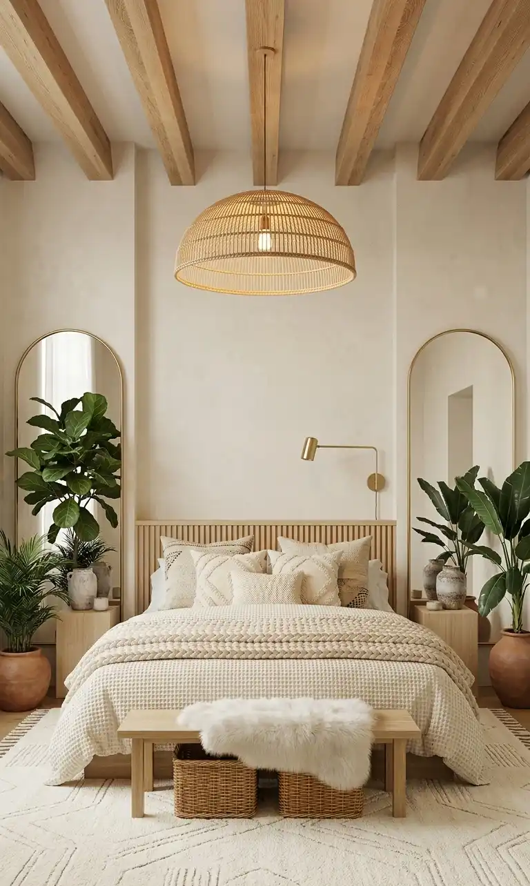 Exposed Timber Beams and Layered Fiber Boho Chic Bedroom Ideas