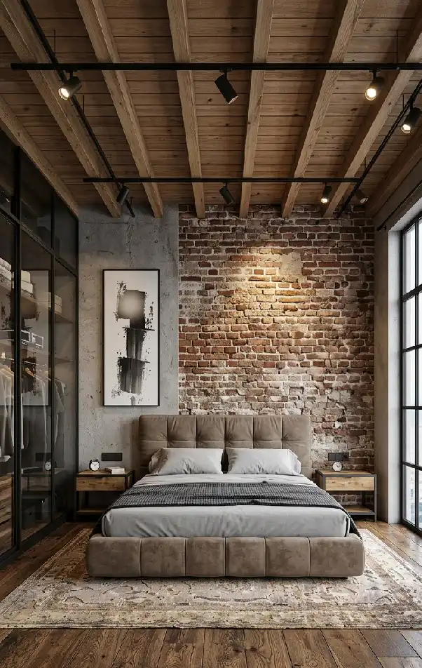 Exposed Track Lighting Grid: Luxury Dark Industrial Bedroom Style and Open-Concept Wardrobe Joinery