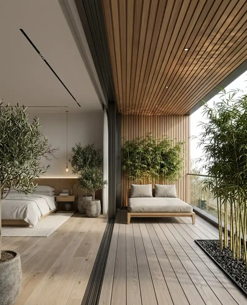 Exterior Timber Decking Transitions as a Covered Balcony Japandi Bedroom Idea Extension