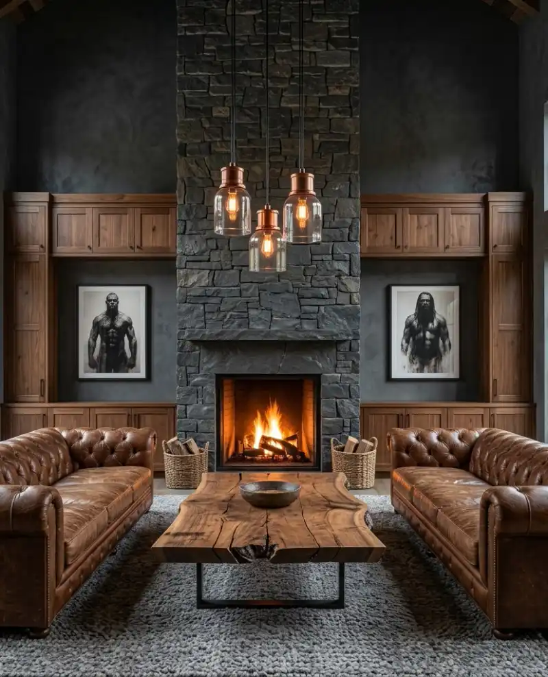 Fireside Focus: A Symmetrical Rustic Living Room Idea
