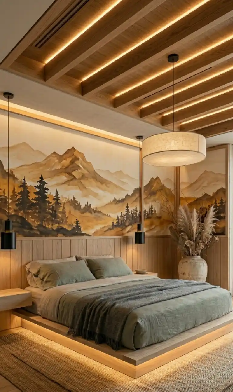 Floating Geometries: A Contemporary Japandi Bedroom Idea with Indirect Lighting and Ash Veneer
