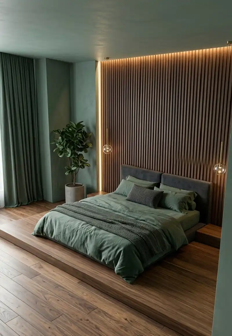 Green Bedroom : Contemporary Cantilevered Platform with Fluted Wood Paneling