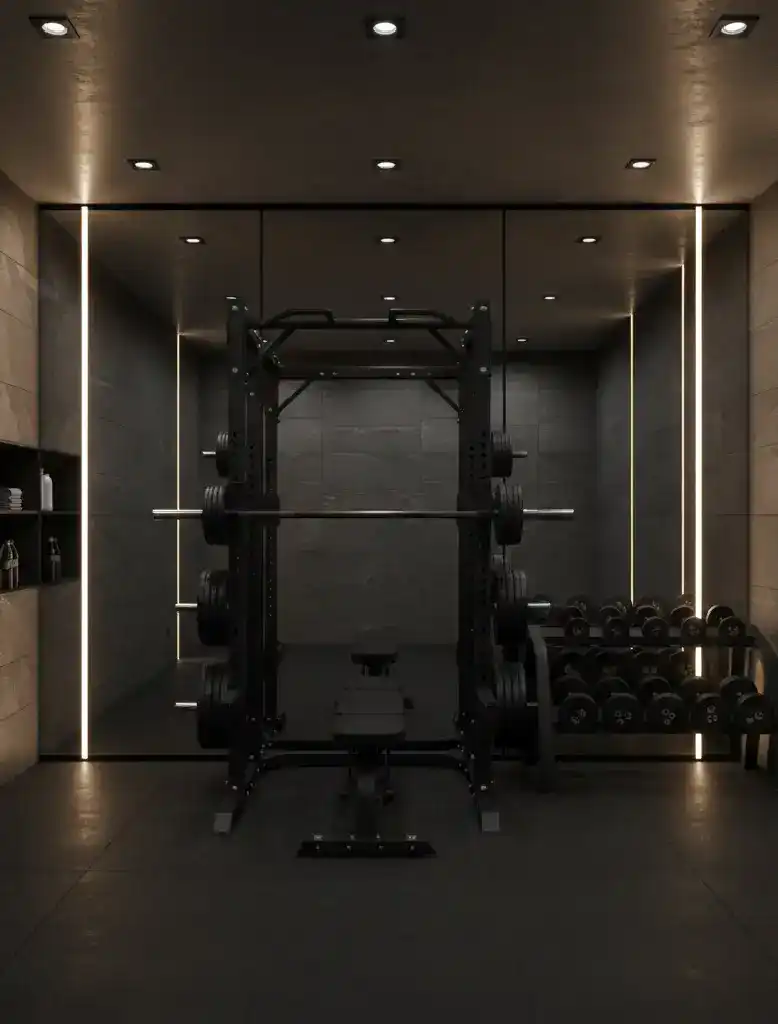A sophisticated, monochromatic space utilizing dark slate wa...