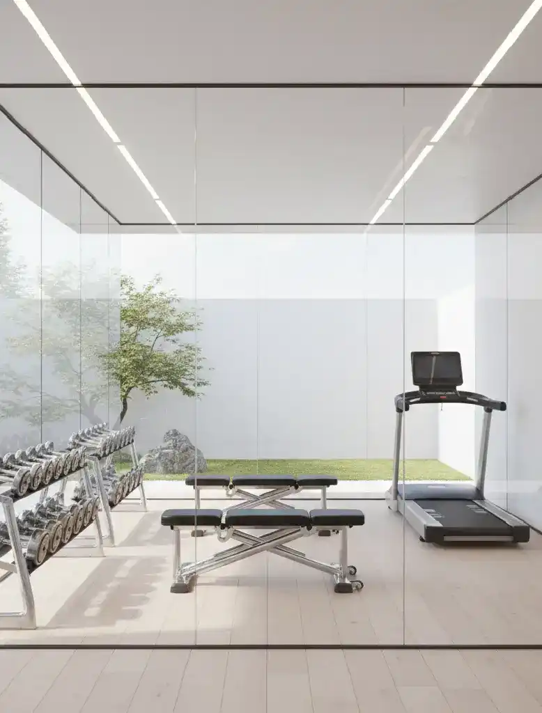 A bright, high-tech gym enclosed in floor-to-ceiling glass w...