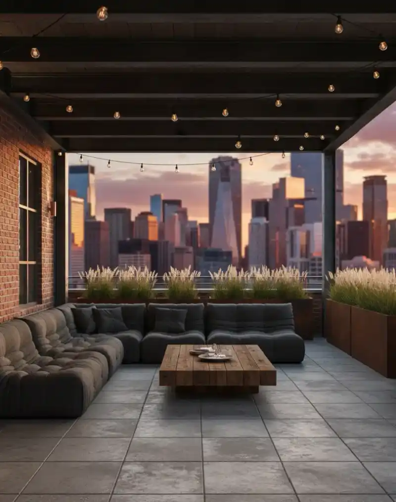 Industrial Chic Balcony with Brick Accents and Panoramic Skyline View