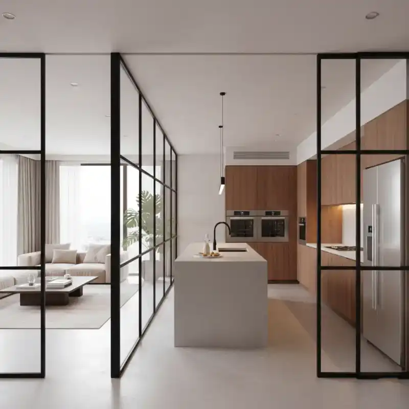 Industrial Modern Open Kitchen with Steel-Framed Glass Partitions.