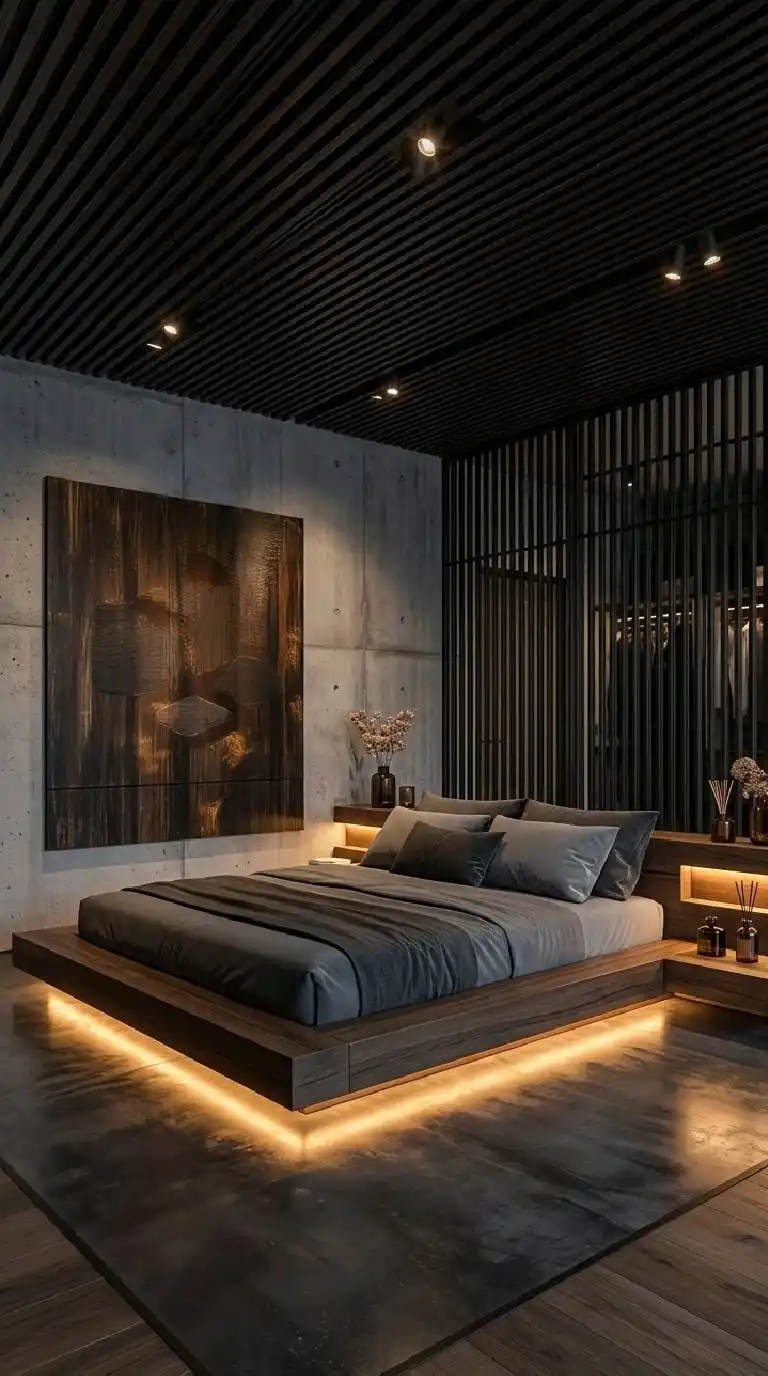 Industrial Noir Loft: Sophisticated Platform Suite with Cleft Slatted Ceiling