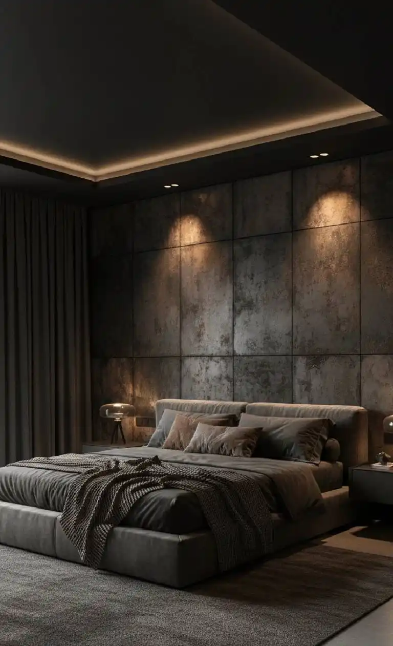 This bedroom design explores a bold, industrial-modern aesth...