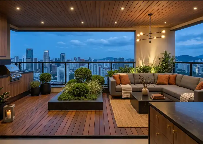 Integrated Luxury Modern Balcony Idea with Hardwood Decking and Basalt Accents