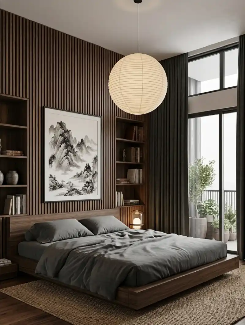 Integrating Custom Oak Carpentry and Hanging Lanterns for a Unified Japandi Bedroom Idea