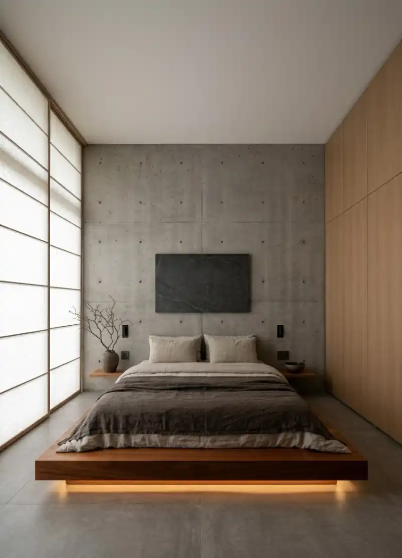 Japandi Bedroom Idea with Monolithic Concrete and Timber Contrast