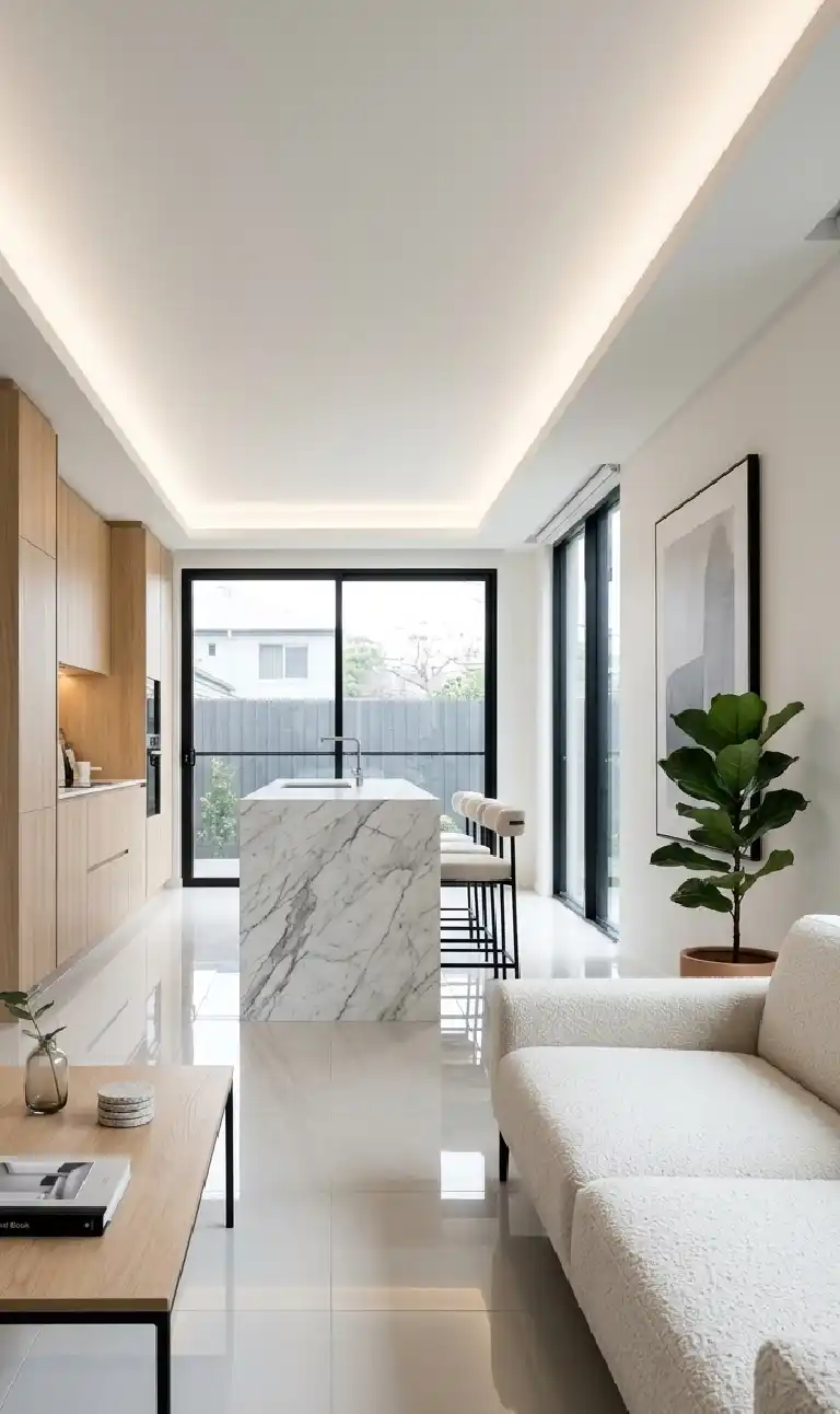 Linear Integration: Minimalist Small Living Room Design with Marble Accents