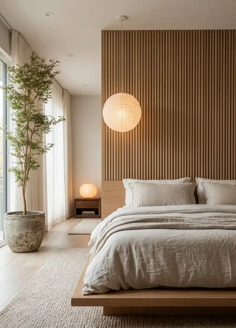Low-Angle Architectural View of a Japandi Bedroom Idea Featuring Oak Slatted Feature Wall