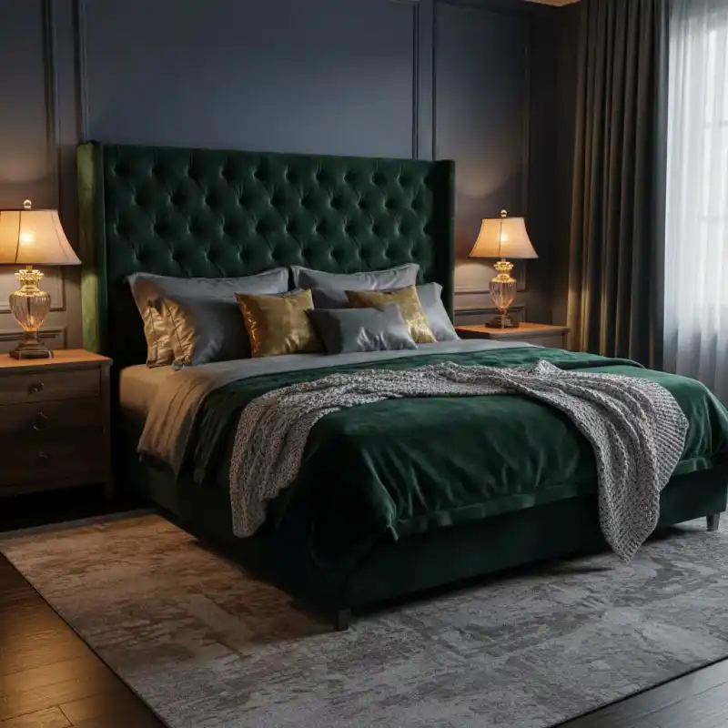 High-end cozy decor featuring a tufted headboard, silk pillo...