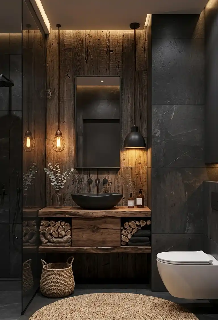 Luxury Dark Bathroom Idea: Monolithic Slate and Reclaimed Timber Integration