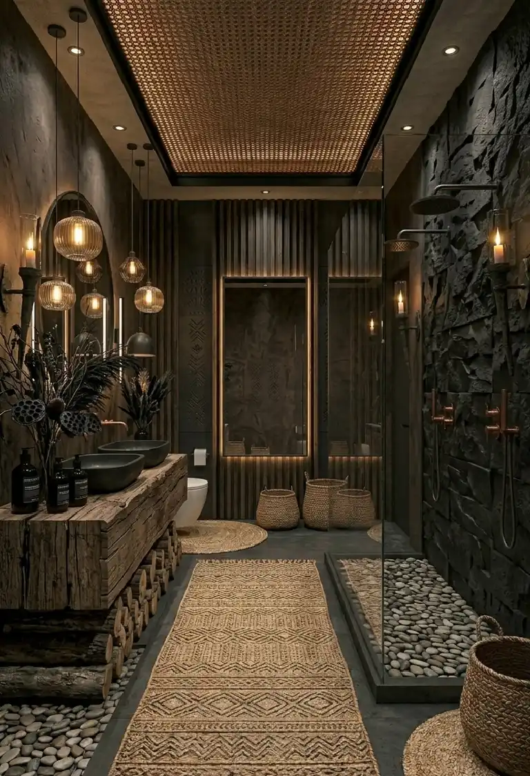 Luxury Dark Bathroom Idea: The "Charcoal Forest" with Timber Cladding
