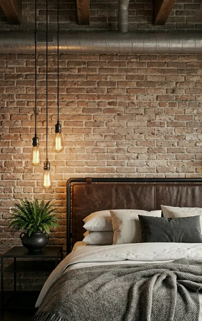 Luxury Dark Bedroom Idea Centered on Industrial Drop Pendants in an Industrial Bedroom Style