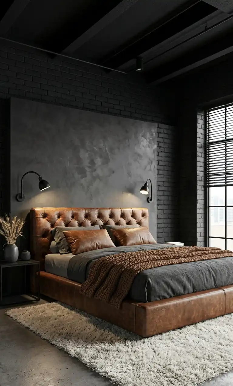 Luxury Dark Bedroom Idea Featuring Tufted Leather Upholstery in an Industrial Bedroom Style