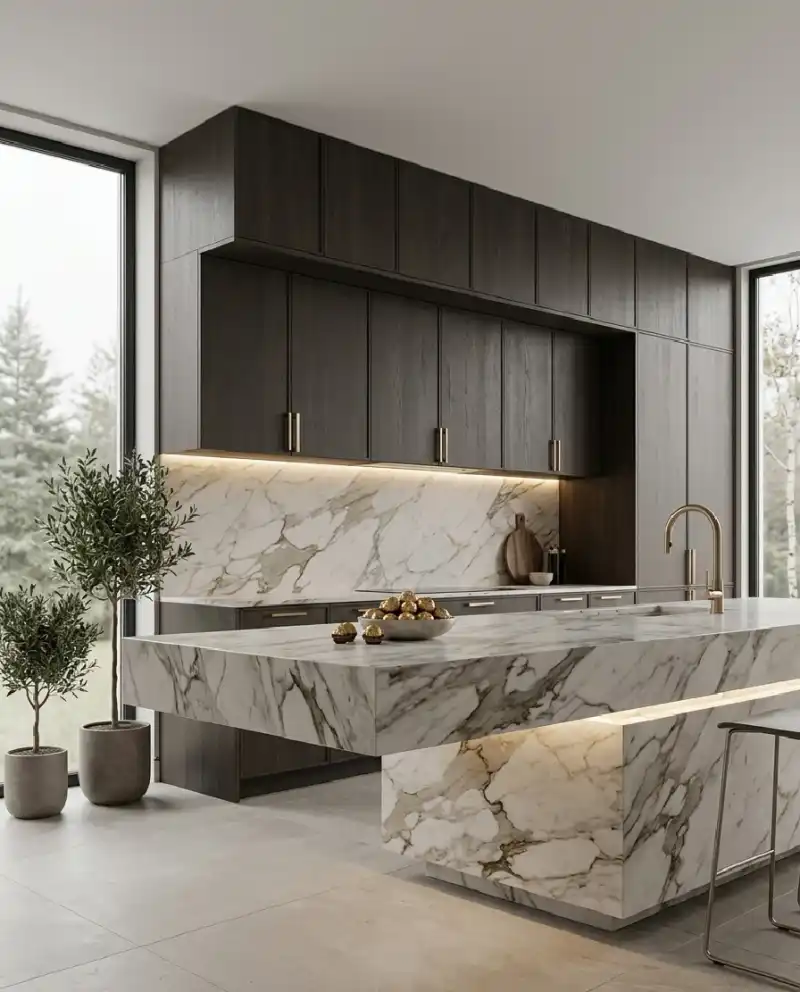 Luxury Modern Kitchen Idea: Cantilevered Marble Island and Smoked Oak Accents