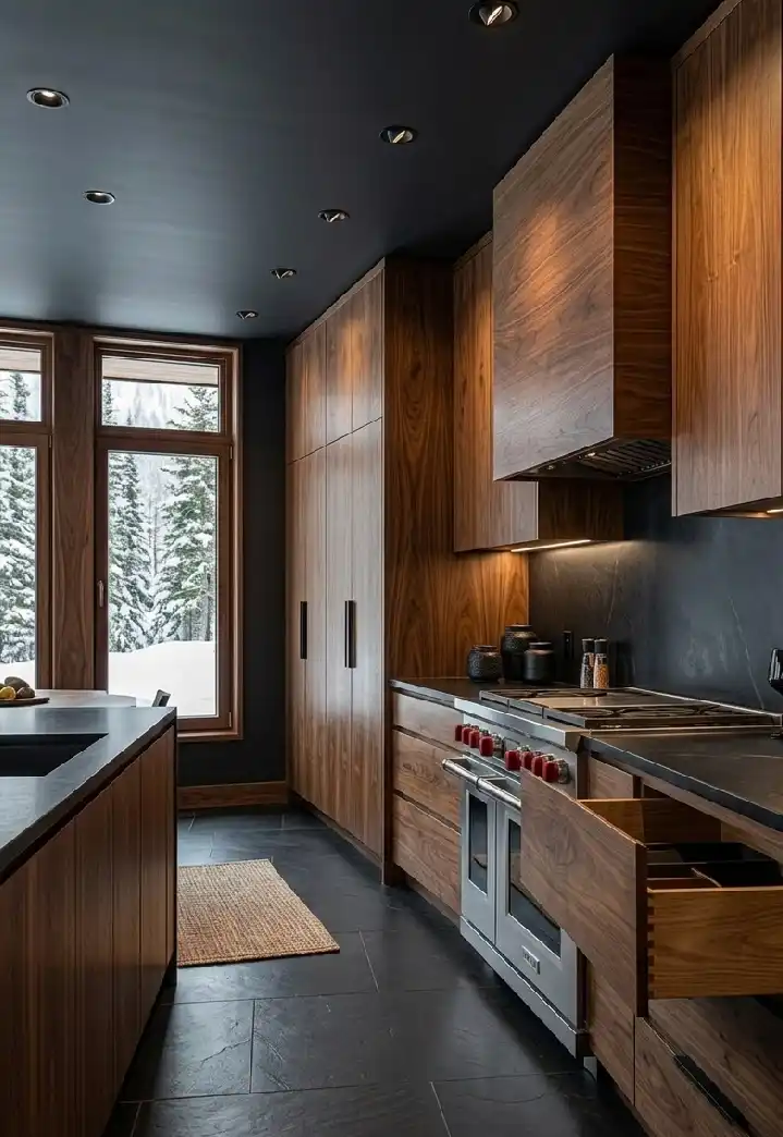 Luxury Modern Kitchen Idea: Deep Grain Walnut with Integrated Stone Backsplash