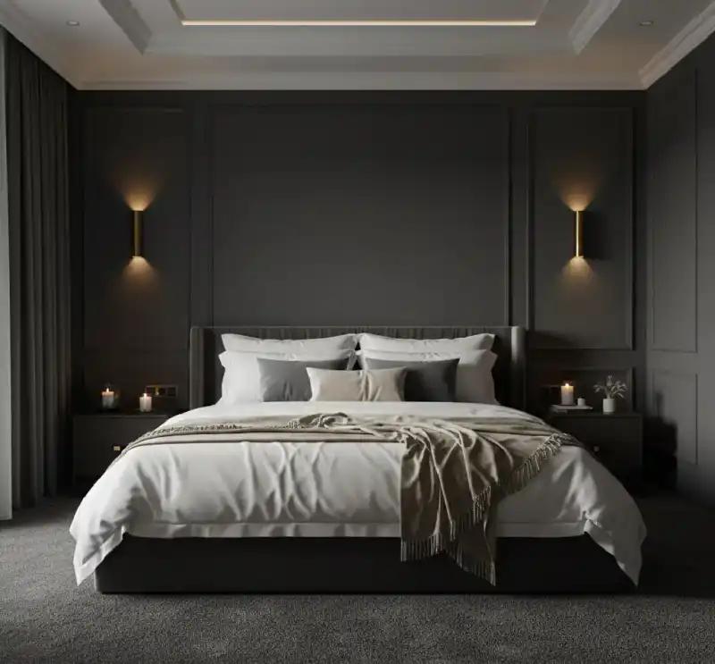 A luxurious bedroom design that plays with contrast. Moody, ...