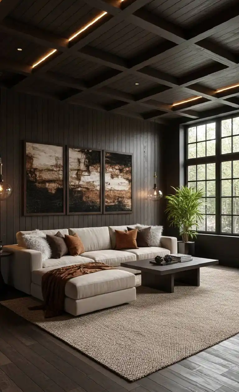 This living room is a sophisticated exploration of monochrom...