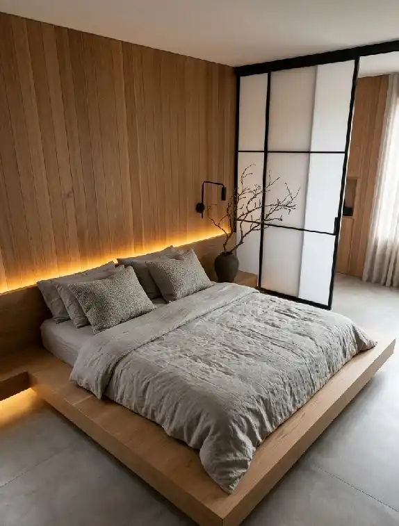 Minimalist Architectural Japandi Bedroom Idea with Cantilevered Platform