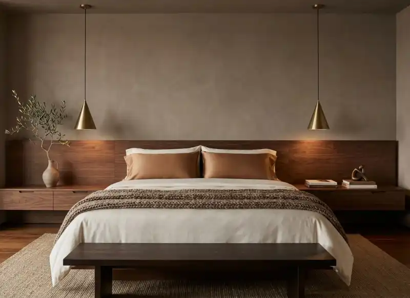 Minimalist Geometry and Plaster Finishes in Brown Luxury Bedroom Design Excellence