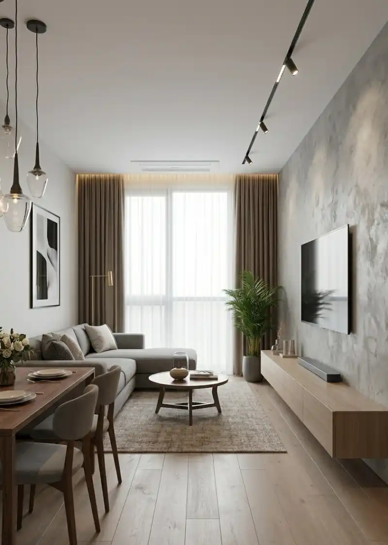 Minimalist Small Living room design featuring Monochromatic Textiles and Polished Concrete