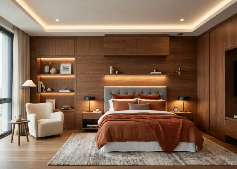 Modern Bedroom Design Featuring a Seamless Wood Veneer Cladding and Recessed Millwork