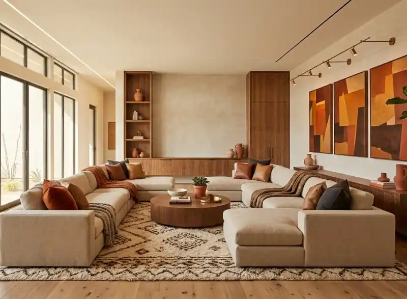 Modern Family Room Idea: Axial Layout with Linear Fenestration and Earth-Tone Textures