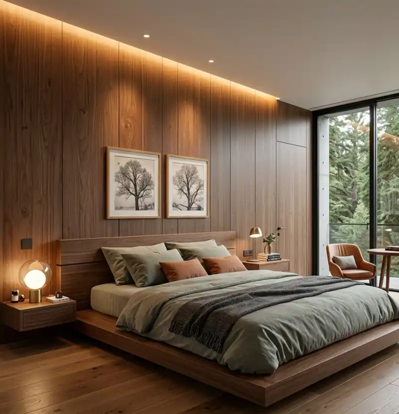 Modern Luxury Bedroom: Linear Walnut Paneling and Cantilevered Geometry