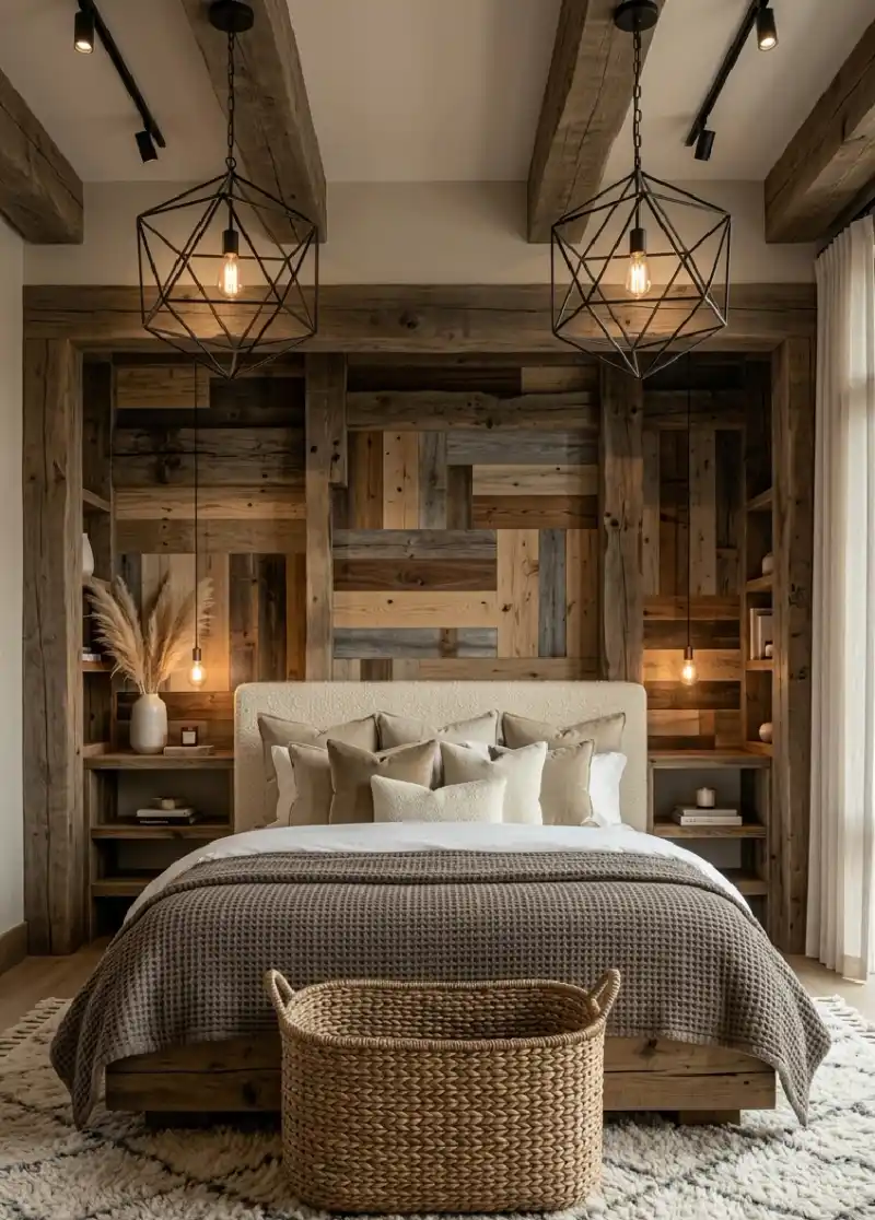 Modern Rustic Bedroom: Mixed-Material Palette and Geometric Lighting