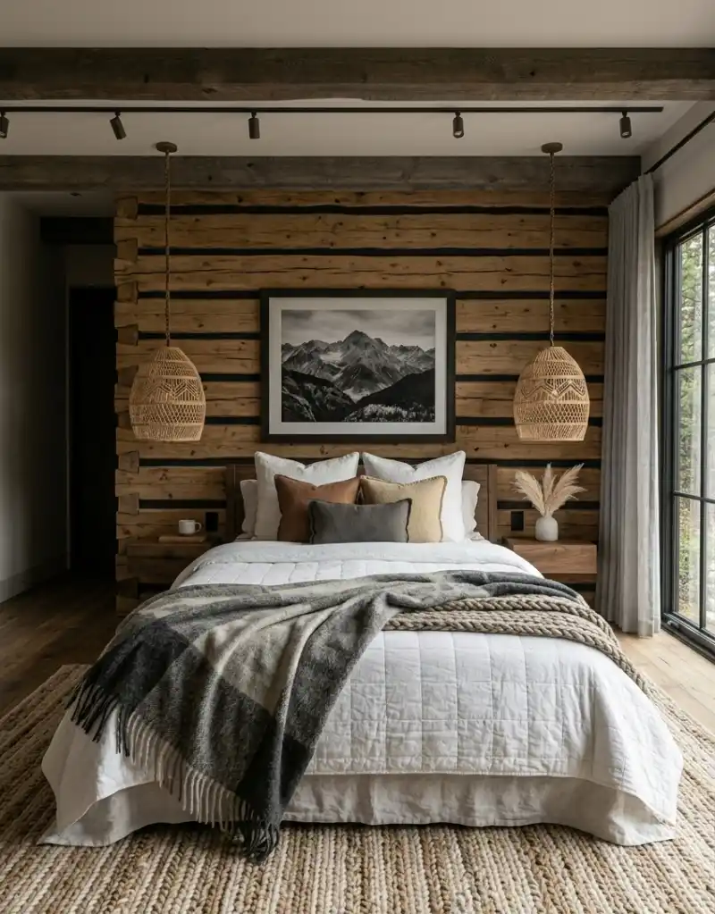 Modern Rustic Bedroom with Layered Textiles and Log-Cabin Sophistication