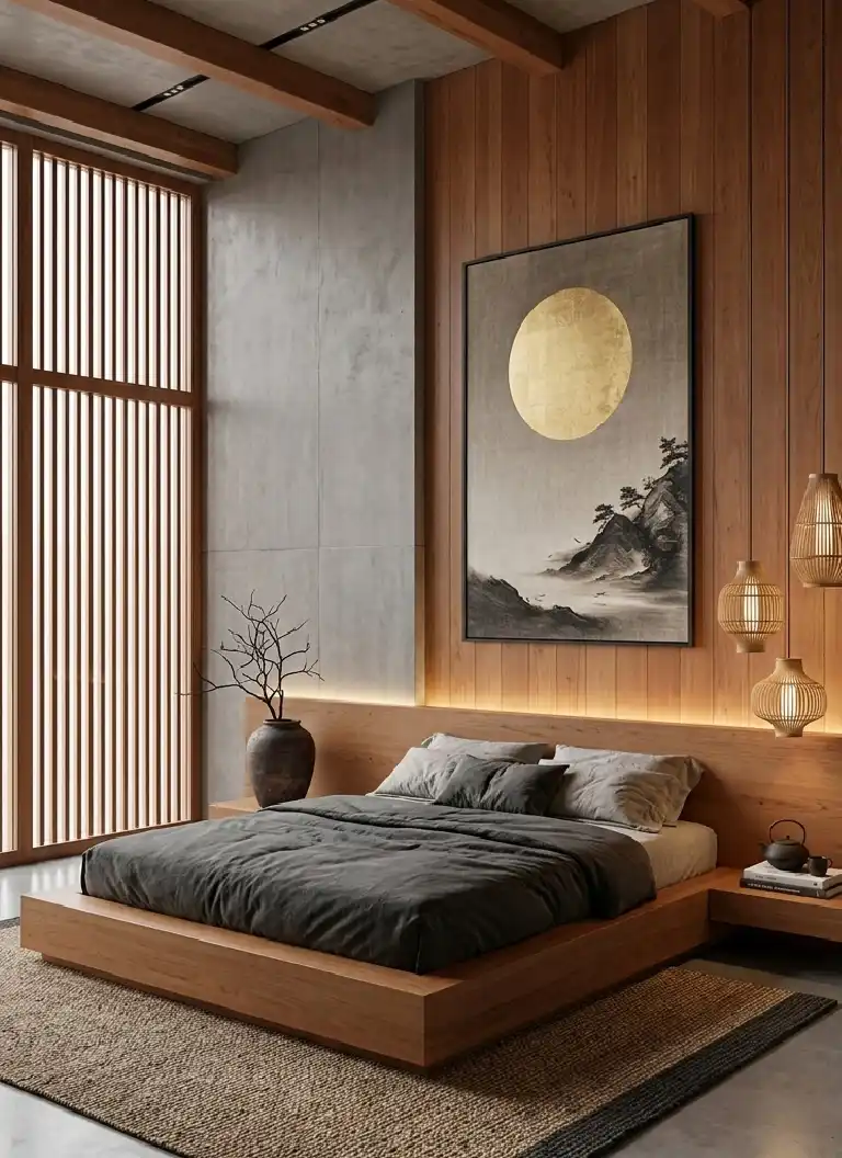 Modern Zen Japandi Bedroom Idea with Polished Concrete and Warm Timber Overlays