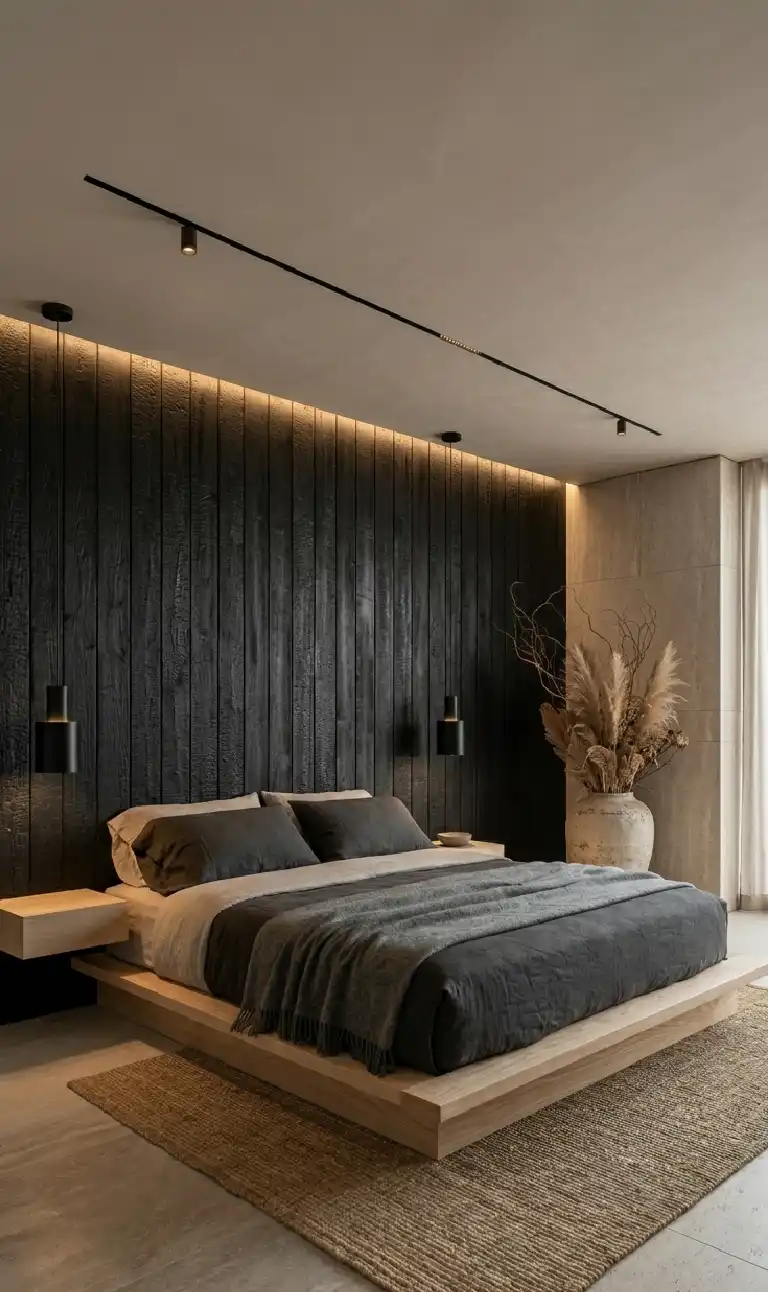 Monochromatic Depth: An Earth-Toned Japandi Bedroom Idea Utilizing Shou Sugi Ban and Travertine