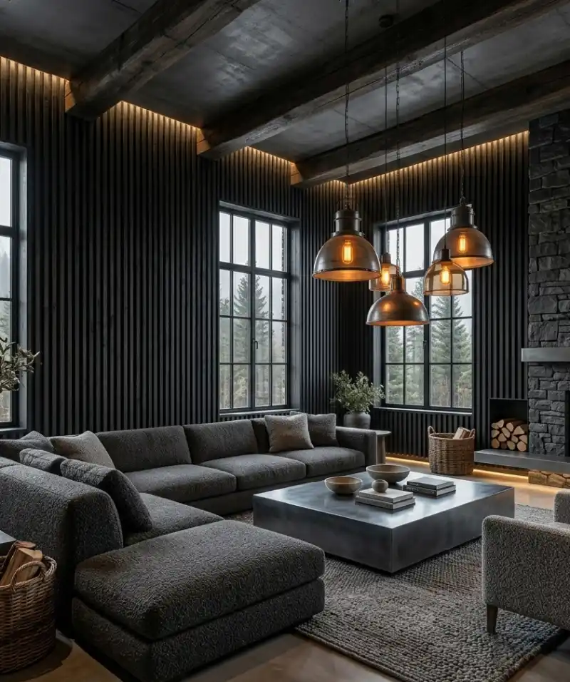 Monochromatic Mood: Rustic Living Room Idea featuring Charcoal Slat Walls