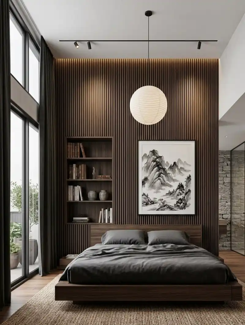 Monochromatic Vertical Slat Paneling as a Modern Japandi Bedroom Idea with Built-in Millwork