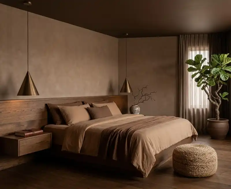 Monochromatic Warmth: An Integrated Brown Luxury Bedroom Design with Wood Accents