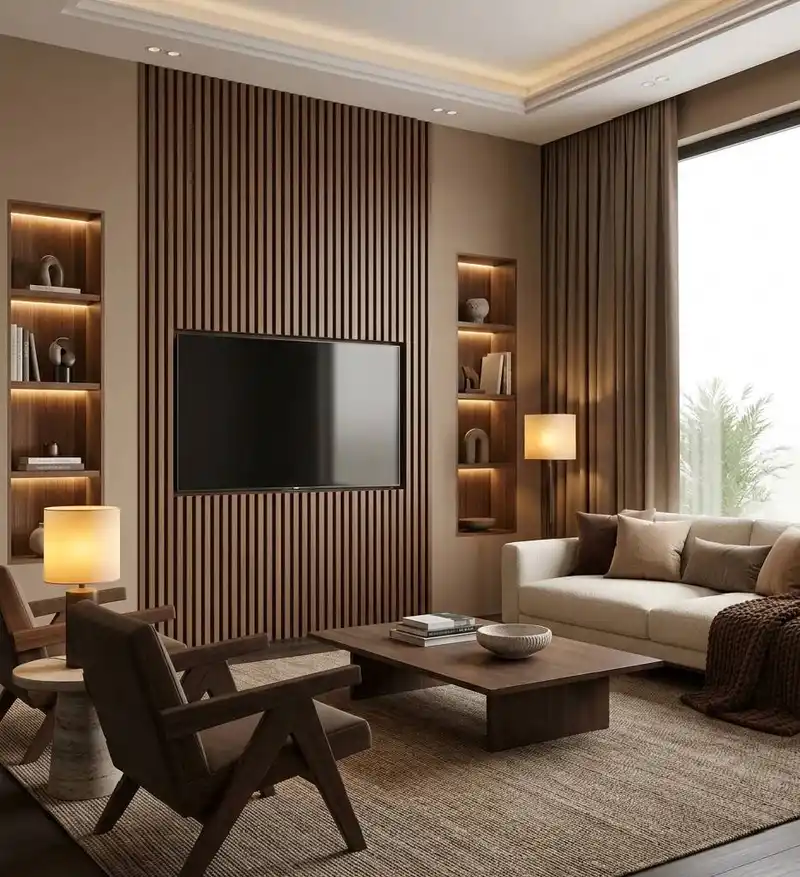 A sophisticated living area where the fluted wood paneling w...