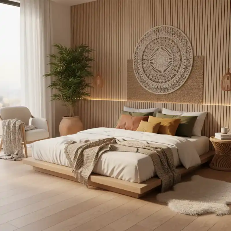 Serene Bohemian Bedroom Decor with Natural Wood and Indoor P...